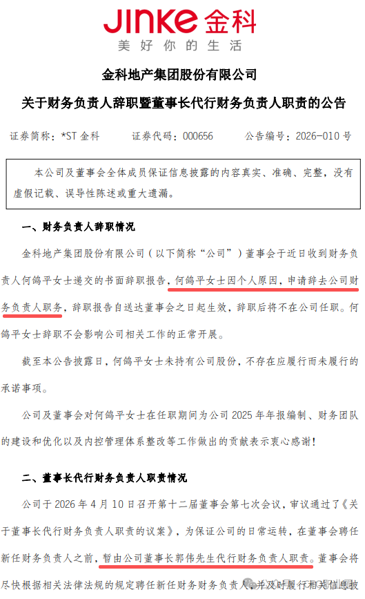配资炒股2026年4月11日,深交所主板上市公司ST金科(000656.SZ)发布了《关于财务负责人辞职暨董事长代行财务负责人职责的公告》。公告显示,何鸽平女士因个人原因,申请辞去公司财务负责人职务,辞职后将不在公司任职。在董事会聘任新任财务负责人之前,暂由公司董事长郭伟先生代行财务负责人职责。